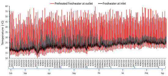 Monthly temperature variation of the freshwater from the supply temperature () and the preheated freshwater after heat recovery () from the hot kitchen wastewater.