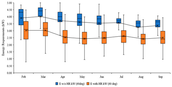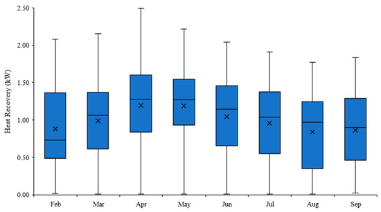 Power savings from the heat recovery unit are shown in Figure 7, where a maximum of hourly average of approximately 2.49 kW was achieved during the summer period. The mean rate of hourly heat recovered ranged from 0.86–1.19 kW, and the median kW ranged from 0.73–1.28. There is more variability in the upper quartile range above the median values, especially for the maximum recovery rates, but below the median quartiles, the heat recovery minimum approaches zero. In all likelihood, this is linked to the kitchen activities and operation. Heat recovery is approaching zero as there is no wastewater generation occurring at this point, and variability between the monthly maximum range is dependent on the level of customer activity. Furthermore, there is less variability when more heat recovery occurs, as seen with the shorter interquartile range for April and May, indicating more kitchen activity and a constant influx of customers.
