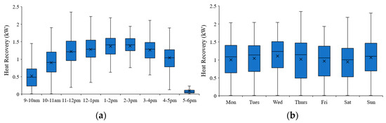 The rate of heat recovery was further disaggregated based on their operational hours and time of the week in Figure 9. The former shows a clear difference in heat recovery rate based on the time of the day. The Tearooms begins service at 10.30 am, and heat recovery either does not occur or is substantially lower between 9–11 am compared to other periods, particularly at lunchtime. Peak heat recovery rates occur immediately prior to, during and after the lunch period. The Tearooms close to customers at 3.30 pm, and only post-closure, from 4 pm onwards, is a drop off in the rate of heat recovery from the wastewater observed. Kitchen staff will still be active after business closure in the 4–5 pm period, but all remaining heat in the wastewater system has been extracted after 5 pm.