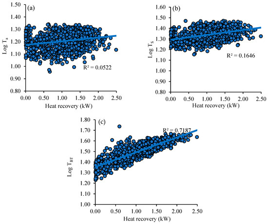 The cold freshwater temperature was found to be a little higher than the ambient temperature during monitoring, which lowers the scope for heat recovery due to a reduced thermal gradient. Figure 10a shows the relationship between the ambient temperature (Log ) and heat recovered, and Figure 10b relates the cold water supply temperature to the heat recovered. In both cases, the recycled heat rises as the ambient temperature and cold water supply increases, counter to the expected impact of the thermal gradients.