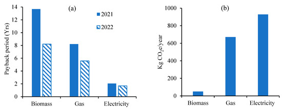 More broadly, considering the three fuel types, a payback period of 13.7, 8.2, and 2.1 years for biomass, gas, and electricity was estimated for 2021, respectively (Figure 11a). The value of energy savings for the different types of fuel amounts to 138, 230 and 919 £/year. The corresponding reduction in carbon emissions across the three fuel types was 49.4, 670.6, and 928.8 kg CO2e/year for biomass, gas, and electricity, respectively (see Figure 11b). Fuel prices for the year 2022 were much higher compared to 2021 due to global inflation and geopolitical issues. In 2022, the payback periods were shortened to 8.2, 5.6, and 1.7 years for biomass, gas, and electricity, respectively. Finally, it should be noted again here that the cost estimates conducted excluded the cost of researchers’ time and commercial profit margins.