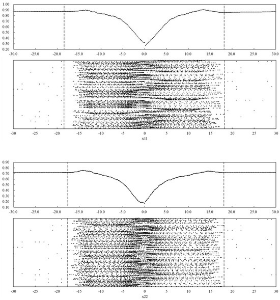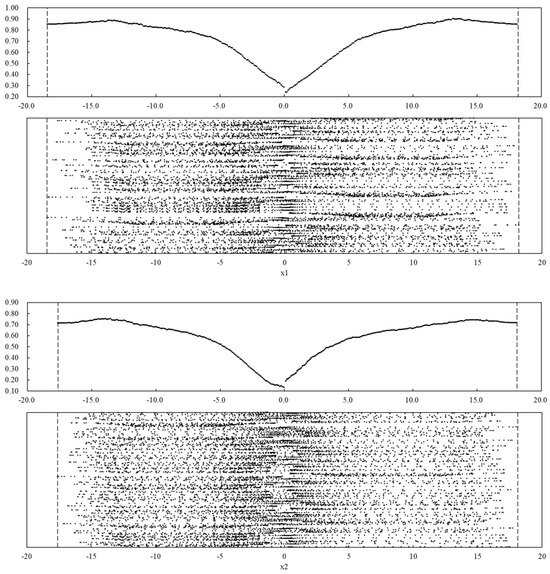 To validate the effectiveness of the method, the same procedure was applied to the original sequences and . If the method is effective, meaning extreme values have no impact on the DFA exponent of the series, then the extreme thresholds for series and should be the same, and the DFA exponents should also be the same. The same parameters were used during the calculation process, and the results are shown in Figure 2. From Figure 2, it can be observed that when the values are taken as 18.19 and −18.45, the DFA exponent of the new series precisely starts to converge to the exponent of the original series, the value of 18.19 and −18.45 can be considered as the thresholds for extreme values in the series . The DFA exponent for series is 0.8556, and for sequence , it is 0.8541, with only minor differences in numerical values, indicating the method’s effectiveness.