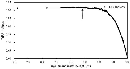 In Section 3.1, the long-range correlation in the significant wave height series for the selected points was examined, and the results showed that all the selected points exhibit long-range correlation. Using the MF-DFA method described in Section 2.2, the threshold for extreme significant wave heights was determined, and in the calculation of the variation of the DFA exponent, were set as .