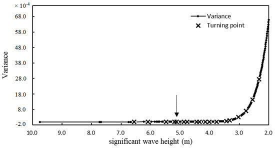 Figure 5 provides the variation of the DFA index with the removal of extreme significant wave height and the variance of the DFA index for point P1. Table 2 presents the significance test results for each site. According to the criteria for critical turning points, the threshold for extremely significant wave height at point P1 is chosen as 5.12 m. The thresholds for extremely significant wave height at the other points are determined to be 3.96, 6.06, 5.59, 4.45, and 5.15 m for points P2, P3, P4, P5, and P6, respectively.
