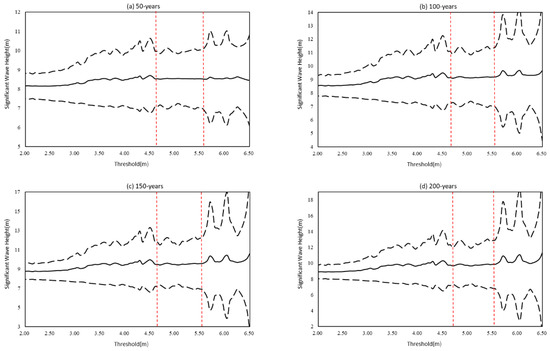 To illustrate the importance of threshold selection in estimating return periods, we conducted a sensitivity analysis of return periods with respect to threshold variations and identified a stable range of thresholds that yield reliable return period estimates. Taking P1 point as an example, we considered a threshold range from 2.0 m to 6.5 m with an interval of 0.05 m, and a sample time interval of 5 days. The results of return periods varying with thresholds are shown in Figure 7. From Figure 7a, it can be observed that as the threshold increases within the range of 2 m to 4.6 m, the return values of significant wave heights gradually increase. This is because as the threshold increases, small significant wave height samples are gradually excluded from the analysis, and since these excluded samples are not extreme values, the remaining samples better represent the significant wave heights. Hence, the return values change continuously within this threshold range, making it inappropriate for threshold selection. Within the range of 4.6 m to 5.55 m, the return values of significant wave heights stabilize, indicating that the exclusion of samples due to an increase in the threshold no longer significantly affects the return values. At this point, the selected samples can represent extreme events while maintaining a sufficient sample size for reasonable return period estimation. Therefore, this range is generally considered suitable for threshold selection. For thresholds greater than 5.55 m, the confidence intervals of return values for significant wave heights exhibit considerable fluctuations, indicating substantial uncertainty in return period estimation within this threshold range. As the threshold increases, reasonable extreme wave height values are gradually excluded, and the sample size becomes insufficient, leading to significant errors in model estimation. Consequently, thresholds in this range are also not recommended for selection.