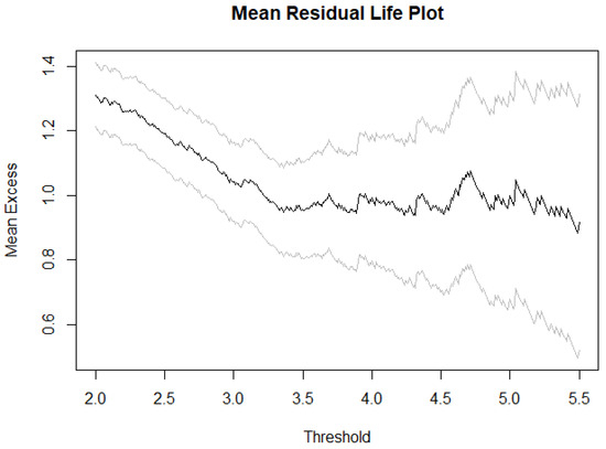 You can plot a scatter plot of the threshold and the arithmetic mean of the excess values using the given equation. When the shape parameter is a constant, this plot will approximate a straight line. In this plot, the threshold is taken as the x-axis, and the arithmetic mean of the excess values is taken as the y-axis. The resulting line will have a slope of and an intercept of . Exactly, if after a certain threshold , the slope of the line remains constant, then the point where the slope stabilizes can be considered as the threshold value. In other words, after this point, the relationship between the threshold and the arithmetic mean of the excess values becomes more stable, indicating that the excess values are well-behaved and can be reliably modeled. Therefore, is a suitable threshold value for the Mean Excess Function method.