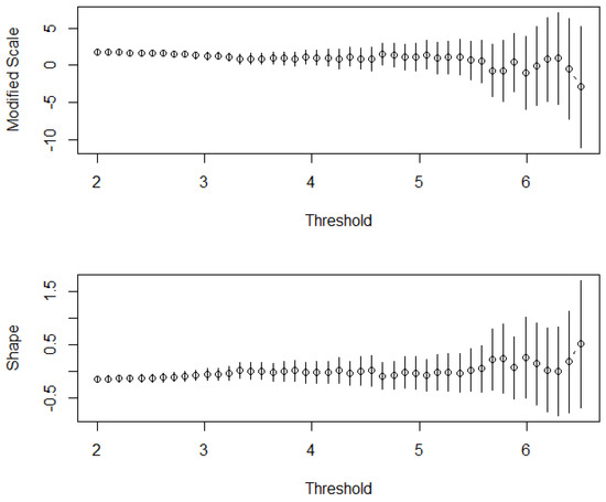 In the above equation, is held constant with respect to the threshold , so the corrected scale parameter and shape parameter should remain constant for values greater than the threshold . By plotting the confidence intervals of and against the threshold , the appearance of constant segments can be used to determine the optimal threshold position.