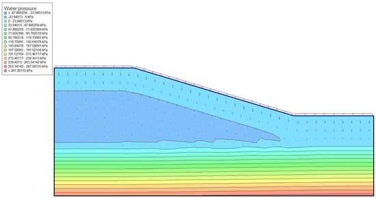 Among them, there is the slope numerical model SEEP/W module: (1) It is used to analyze the seepage and pore water pressure of porous materials such as soil. (2) It is used for the seepage problem of unsaturated soil. The saturated–unsaturated calculation model in SEEP/W software allows the software to simulate steady-state and transient seepage processes. (3) The saturated–unsaturated calculation model in the software allows the software to simulate steady-state and transient seepage processes. It can add the soil–water characteristic curve suitable for engineering analysis by itself and calculate the movement of the soaked surface and the dissipation process of pore water pressure. SIGMA/W module: (1) With linear and nonlinear elastic models, elastoplastic models, and elastoviscosity models, it can perform stress–strain analysis on soils in different environments. (2) It can calculate the excess pore water pressure of the soil under a load and analyze the slope stability. The pore water pressure in SEEP/W can be called in SIGMA/W to simulate the generation and dissipation of pore water pressure, which is used for slope consolidation settlement and stress–strain analysis.
