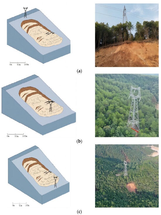 Relative position relationship between the tower and landslide disaster. (a) The tower is located at the top of the slide. (b) The pole and tower are located within the range of the sliding body. (c) The tower is located below the slope.