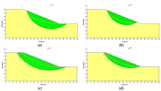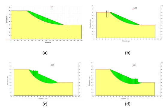 Safety factor diagram of slope at different positions of poles and towers. (a) The tower is at the bottom of the slope. (b) The tower is located at the top of the slope. (c) The tower is located in the upper part of the broken surface. (d) The pole and tower are located on the lower part of the slope.