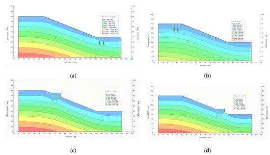 (2) The maximum total stress on the slope increases with the increase in the depth at different positions of the pole and tower, the contour line is basically parallel to the slope surface, and the stress concentration occurs in the downward direction of the extension pile. However, no matter where the tower is located on the slope, the stress concentration will occur at the downhill foot of the platform, and the range will expand from top to bottom, which may cause soil structure damage under the platform, resulting in instability.
