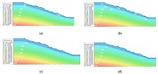 Distribution of the pore water pressure contour under different rainfall intensities. (a) 20 mm/d. (b) 45 mm/d. (c) 90 mm/d. (d) 190 mm/d.