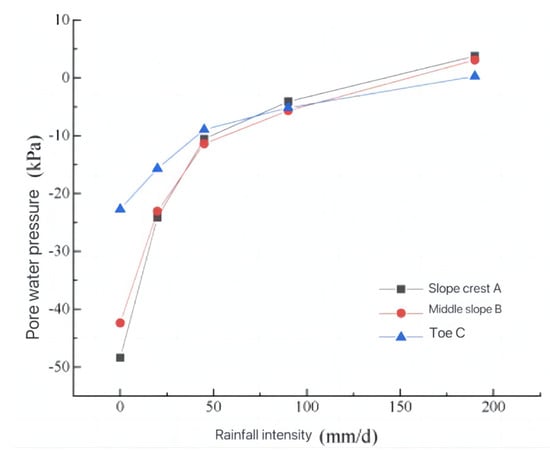 As can be seen in Figure 5, the pore water pressure changes at different marks of the slope for different rainfall intensifications on the 5th day, and the greater the rainfall intensity, the greater the impact of the rainfall. Because they are shallower from the slope surface, the pore water pressure changes significantly during rainfall, and the pore water pressure changes gradually from negative to positive. The top of slope A changes the most under different rainfall intensities, followed by the middle of slope B, and the bottom of slope C is easily saturated in the rainfall process.