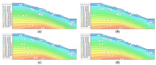 Maximum shear stress contour distribution on the 5th day of rainfall under different rainfall intensities. (a) 20 mm/d. (b) 45 mm/d. (c) 90 mm/d. (d) 190 mm/d.