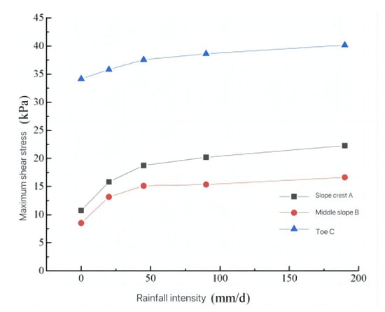 By comparing the maximum shear stress of different rainfall intensities on the 5th day, it can be seen from Figure 7 that the greater the rainfall intensity, the greater the rise in the the maximum shear stress at the monitoring point inside the slope. Comparing the maximum shear stress at different positions, the shear stress at the foot of slope C is greater than that at the middle B and the top A of the slope. Under different rainfall intensities, the maximum shear stress increment of the slope top A and slope middle B is larger than that of slope foot C.