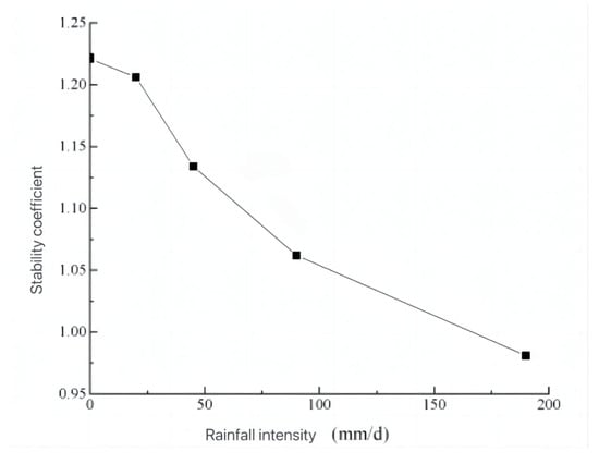 Geo-Studio software was used to calculate the stability coefficient of different rainfall intensifications and the position of the slip plane after 5 d of rainfall to make a comprehensive evaluation of the slope. The changes in the slope stability coefficient of different rainfall intensifications after 5 d of rainfall are shown in Figure 8.
