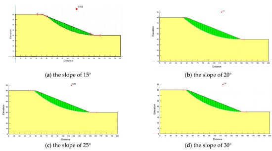 In order to study the influence of the soil slope change on its stability under heavy rainfall conditions. As shown in Table 4, four different slope sizes of 15°, 20°, 25°, and 30° were set, respectively, to change the slope of the residual soil, with other parameters unchanged, and the stability coefficient of 190 mm/d rainfall intensity was calculated.