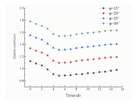 As can be seen in Figure 11, when the slope is 15°, the safety factor of slope stability is 1.058; when the slope is 20°, the safety factor of slope stability is 1.211; when the slope is 25°, the safety factor of slope stability is 1.490; When the slope is 30°, the safety factor of slope stability is 1.788. The greater the internal friction angle, the greater the stability coefficient of the slope. As shown in Figure 12, under different internal friction angles, the stability coefficient decreases gradually with the longer rainfall time and increases gradually after the rain stops. This is because with the infiltration of rainfall, the volume water content of soil gradually increases, the shear strength of soil decreases continuously, and the stability coefficient decreases continuously. In the stage of stopping rain, the rainwater permeates, the volume water content of soil gradually decreases, the shear strength of soil increases, and the stability coefficient shows an increasing trend.