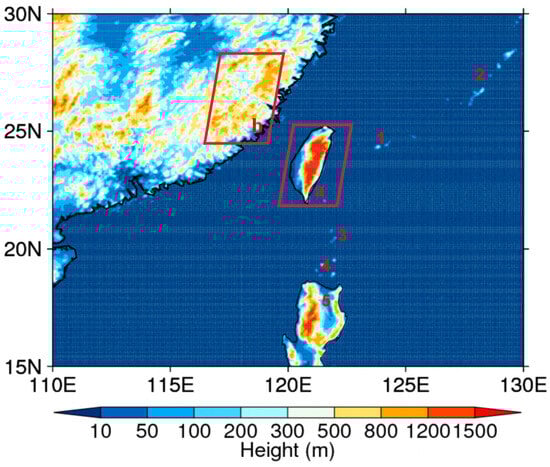 Fujian Province, Taiwan Strait, Taiwan Island, the eastern sea of Taiwan Island and some islands near Taiwan Island were identified as the study area. The terrain height of the study region is shown in Figure 1. To investigate the terrain effects, Taiwan Island was set to be either present or absent in the real and control cases. We analyzed the wind characteristics of the four regions and the typhoon characteristics during typhoon events to investigate the typhoon influences. The typhoon wave characteristics in the Taiwan Strait and eastern sea of Taiwan Island were analyzed and compared with typhoon characteristics to analyze the relationship between wind and waves. The reason for the differences between wind and waves is explained in terms of wave theory and terrain effects.