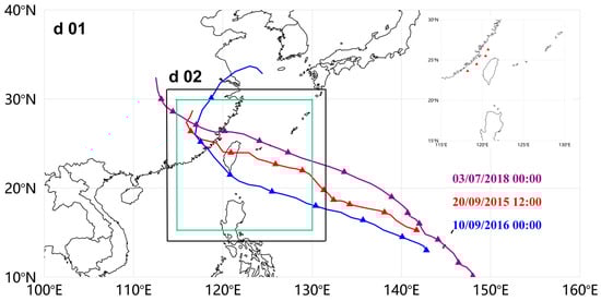 The WRF model developed by the National Centre for Environmental Prediction and the National Centre for Atmospheric Research is effective in simulating various weather events and was used to simulate typhoon events in this study [,]. The model version 3.9.1 was used, and the code can be obtained from the official website (https://www2.mmm.ucar.edu/wrf/, accessed on 25 September 2023). The spatial resolution of the WRF model outer domain was 25 km and the domain covered the Western Pacific, Taiwan Island and Fujian Province (Figure 2). The full process, including the formation, development and extinction of the typhoons, was simulated using the WRF model. The WRF model’s inner domain with a grid size of 5 km focused on Taiwan Island. Terrain elevation in the WRF model was derived from a global topographic data set produced by the United States Geological Survey with a spatial resolution of 1 km. Land cover and land use data were derived from MODIS and the spatial resolution was 500 m. Physical scheme options are important in the WRF model. There are many choices for the different physical processes in the model. Morrison, RRTMG/RRTMG and Grell 3D were chosen as the microphysics, long/short wave radiation and cumulus schemes [,,]. The initial meteorological and boundary conditions were derived from the Final Analysis reanalysis data (https://rda.ucar.edu/datasets/ds083.2/, accessed on 25 September 2023), with a spatial resolution of 1° and temporal resolution of six hours. This product is from the Global Data Assimilation System, which collects observational data from the Global Telecommunications System and other sources. The four-dimensional nudging technique was applied to ensure that the typhoon path was correct. The time-points for starting the simulation were three days before the typhoon events, and the first three days were set as the spin-up of the model. The simulation times of the three typhoon events ended at the extinction of the typhoons.
