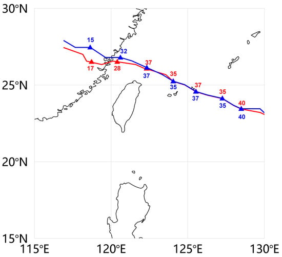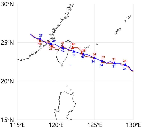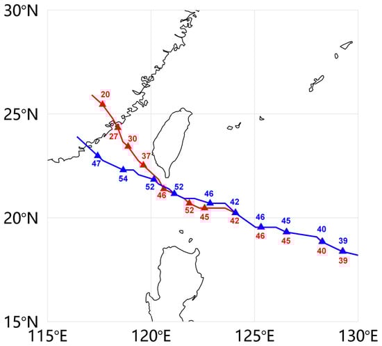 Simulated typhoon tracks of Meranti in real (red line) and control (blue line) cases. Typhoon locations and max wind speed (m/s) every six hours are marked as triangles and numbers.