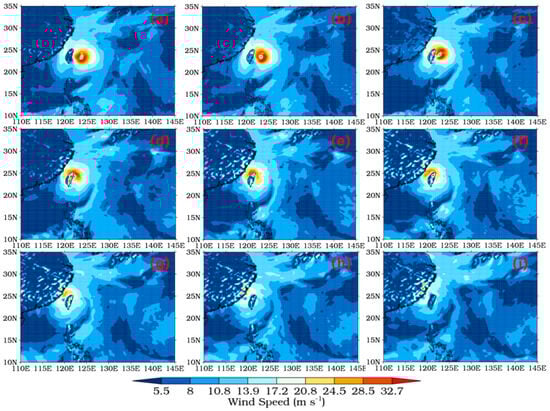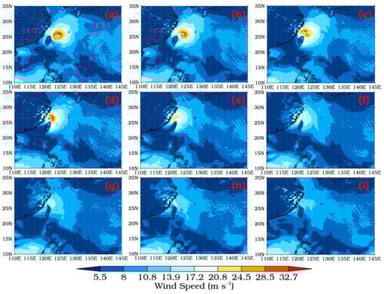 Wind speed distributions at three-hour intervals from 12:00 on 13 September to 12:00 on 14 September 2016 ((a–i) relate to chronological order, (a) refers to the first time point and (i) refers to the last time point).