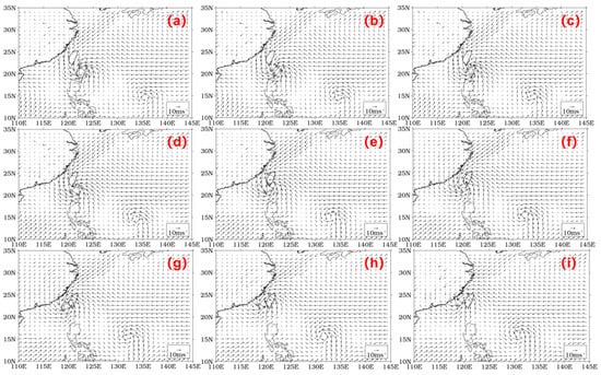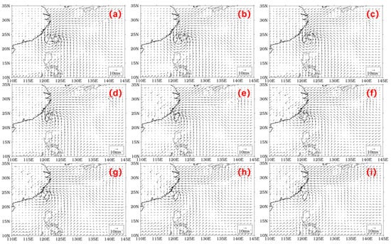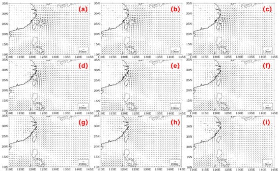 Wind vectors at three-hour intervals from 12:00 on 13 September to 12:00 on 14 September 2016 ((a–i) relate to chronological order, (a) refers to the first time point and (i) refers to the last time point).