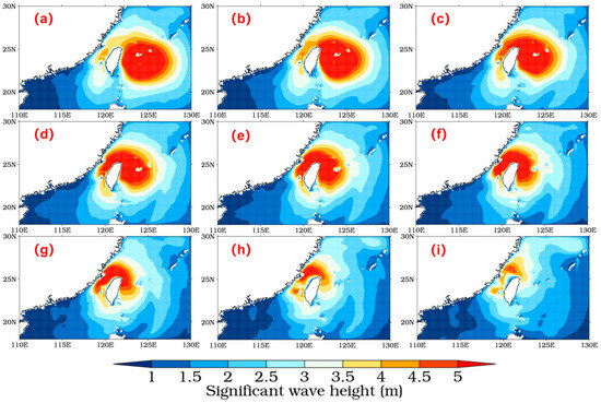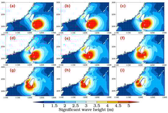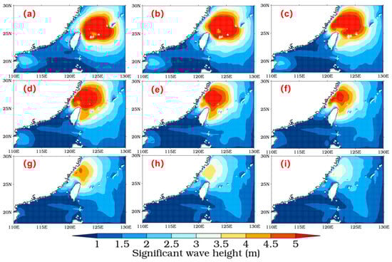 Significant wave height distributions at three-hour intervals from 12:00 on 13 September to 12:00 on 14 September 2016 ((a–i) relate to chronological order, (a) refers to the first time point and (i) refers to the last time point).