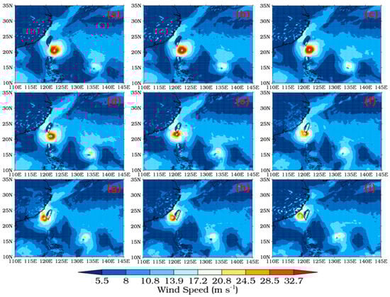 The wind speed at three-hour intervals from 00:00 on 28 September to 00:00 on 29 September 2015, as shown in Figure 13, were used to investigate the wind characteristics near Taiwan Island as Typhoon Dujuan passed through the island. Before Dujuan arrived in the Taiwan Strait, the wind speed in the Strait increased during September 27–28 because of the Venturi effect. Additionally, the wind speed decreased, and the intensity distribution was destroyed by Taiwan Island. The wind speed on the east side of Taiwan Island increased as Dujuan approached the island and decreased when it moved away.