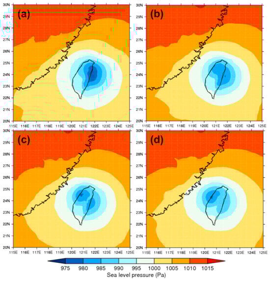To investigate the reason for the skip, the sea level pressure distribution during the landing of Dujuan in Taiwan Island is shown in Figure 12. The point with the minimum sea level pressure is regarded as the typhoon center in the model. This result suggests that the former low-pressure center on the east side of the island disappeared as the typhoon made landfall. A new center of low pressure appeared on the west side of island and made the typhoon center skip. In addition, the decelerating effect of Taiwan Island on Dujuan was hard to calculate because of the discontinuous track.