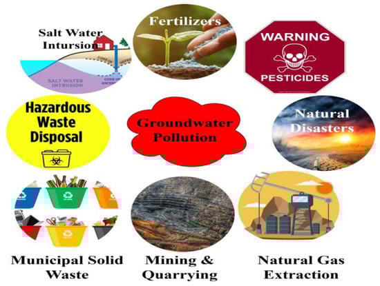 Generally, groundwater contamination may be due to natural and anthropogenic activities. Natural processes such as climate change, natural disasters, soil matrix, rock–water interactions, and geological factors will contaminate the freshwater sources [12]. Anthropogenic activities, namely industrial waste discharge, solid and liquid waste, improper disposal of hazardous and biomedical waste, poor management of E-waste, mining activities, utilization of pesticides in agricultural practices, fertilizers, municipal waste, rapid urbanization, and land use, will result in groundwater contamination [12]. Figure 2 illustrates the different sources of groundwater pollution.