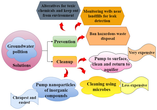 Periodically conducting environmental audits is crucial, and this would result in the creation of a plan to prevent pollution. When an emergency response strategy is being created, high-risk regions must be routinely evaluated. Important aquifers and healthy fields would need to be protected in land use plans. Businesses and residents need to be educated and informed. Every household is required to collect hazardous waste. Monitoring is required for all storage tanks and pipelines, and it is essential to purchase materials of the proper caliber. Keeping track of their lifespan and replacing them as necessary is essential. Water wells that have not yet been used should be appropriately disposed of. Individual, small-, and medium-sized businesses that generate chemical waste must receive special attention. It is best to stop using insecticides and pesticides altogether or to use them as little as possible. The pipeline network and the area around storage tanks should have monitoring wells built regularly. To ensure the early discovery of leaks, these would be inspected regularly. Additionally, a body must be assigned the job of implementing the water policy, and the water policy should explicitly outline all prevention efforts. The public should be well informed, and awareness initiatives and penalties should be clearly stated. Figure 4 illustrates the different solutions to overcome groundwater pollution.