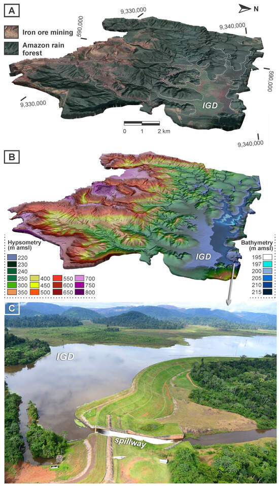 Igarapé Gelado Dam (IGD). (A) Iron ore mining and Amazon rain forest. (B) Hypsometry and bathymetry map. (C) Area, surroundings and lake of the Gelado dam in Carajás, Eastern Amazon.