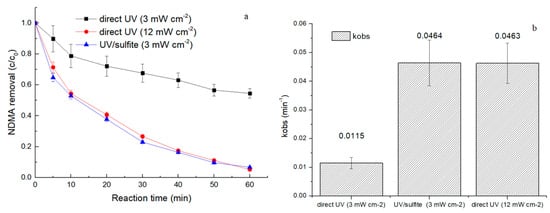 NDMA exhibits absorption peaks at 227 and 332 nm, which makes direct UV photolysis feasible for removing NDMA. However, the UV irradiation intensity required to achieve an acceptable removal efficiency of NDMA is considerable []. Preliminary experiments were conducted in order to compare the removal efficiency of NDMA between direct UV photolysis and the UV/sulfite ARP and the results are shown in Figure 1a. As can be seen, the removal efficiency of NDMA via the UV/sulfite ARP was much higher than that of direct UV photolysis under the same UV intensity (3 mW cm−2). A total of 94.40% of NDMA was removed via the UV/sulfite ARP at the end of the reaction, while only 45.48% of NDMA was removed via direct UV photolysis within the same reaction time. Moreover, increasing the UV intensity can significantly improve the removal efficiency of NDMA via direct UV photolysis. An NDMA removal efficiency of 93.29% was achieved via direct UV photolysis when the UV intensity increased to 12 mW cm−2, which approaches the performance of the UV/sulfite ARP. The degradation of NDMA via direct UV photolysis and the UV/sulfite ARP followed pseudo-first-order kinetics, and the rate constants were calculated and are shown in Figure 1b. The kobs of direct UV photolysis (3 mW cm−2 UV intensity), direct UV photolysis (12 mW cm−2 UV intensity) and UV/sulfite ARP were 0.0115 ± 0.002, 0.0463 ± 0.010 and 0.0464 ± 0.011 min−1, respectively, which was in accordance with the above discussion. Therefore, the degradation of NDMA via the UV/sulfite ARP may be a more effective and energy saving method than direct UV photolysis.