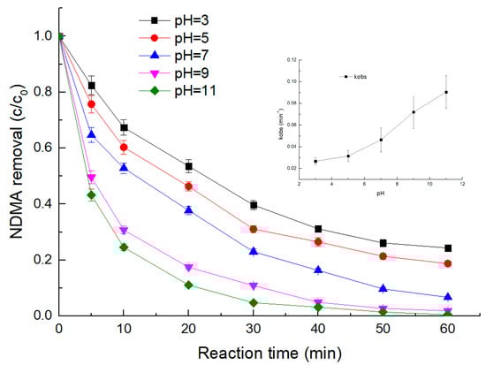 The results shown in Figure 2 indicated that the NDMA removal efficiency was favored under alkaline conditions by UV/sulfite ARP, while acidic conditions would inhibit the degradation of NDMA. The removal efficiency of NDMA increased from 21.57% to 66.79% within the initial 5 min of the reaction when the initial pH increased from 3 to 11. Moreover, NDMA was completely removed from the solution under alkaline conditions (pH = 9 or 11) after the 60 min reaction time, while only around 80% NDMA removal efficiency was achieved under acidic conditions at the end of the reaction. Generally, the distribution of sulfite species (SO32−; HSO3− and H2SO3) in the water changed with different pH. The sulfite was the dominant species in alkaline conditions, while the bisulfite was the dominant species in acidic conditions []. The differences in the UV absorption ability of various sulfite species led to the generation of different reducing radicals, which affected the NMDA degradation via a radical–reaction mechanism. It is reported that bisulfite does not absorb considerable amounts of UV irradiation in the range of 225–300 nm. This absorbance behavior suggests that bisulfite does not generate reducing radicals like sulfite under the UV irradiation in this study (254 nm). As a result, the degradation mechanism of NDMA in acidic conditions is just direct UV photolysis. On the other hand, sulfite can produce more hydrated electrons and sulfite radicals by UV excitation in alkaline conditions, which promotes the degradation of NDMA. Previous studies have confirmed that sulfite radicals and hydrated electrons are the main products of the sulfite photodegradation. In acidic conditions, the concentration of hydrated electrons is 4–5 orders of magnitude lower than in alkaline conditions, which could explain how the pH affects the rate constant for NDMA removal []. In addition, the relationship between rate constants and pH also showed that there was a significant increase in the kobs when the initial pH increased from 3 to 11. The kobs for the initial pH of 3, 5, 7, 9 and 11 was 0.00267 ± 0.001, 0.0315 ± 0.005, 0.0464 ± 0.011, 0.0720 ± 0.015 and 0.0905 ± 0.015 min−1, respectively. This result is consistent with Jung’s study, which investigated the effect of pH on bromate degradation via the UV/sulfite ARP and found that the kobs increased from 0.025 min−1 to 0.10 min−1 when the pH ranged from 3 to 11 [].