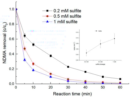 According to the Beer–Lambert law, changing the dosage of the reducing agent will affect the absorption of UV irradiation, which results in a variation in the radical generation rate in ARPs. Thereby, the effect of the sulfite dosage on the removal efficiency of NDMA via the UV/sulfite ARP was investigated in this study. The results from Figure 3 showed that the removal efficiency of NDMA increased from 35.39% to 67.73% within 5 min of the reaction time when the sulfite dosage increased from 0.2 mM to 1 mM. The kobs of different sulfite dosages (0.2 mM, 0.5 mM and 1.0 mM) were 0.0464 ± 0.011, 0.0789 ± 0.014 and 0.0978 ± 0.018 min−1, respectively. According to Botlaguduru’s research, the degradation of pollutants via ARPs included two pathways: (1) direct photolysis and (2) decomposition based on radical reactions []. If the direct photolysis is the dominant reaction pathway for the degradation of NDMA via ARPs, the higher sulfite dosage means that most of the UV will be absorbed by sulfite under certain UV intensities, which results in a corresponding reduction of UV used for the NDMA photolysis. But, if the radical reaction is the dominant reaction pathway, the higher sulfite dosage could accelerate the generation rate of reducing radicals and promote the degradation of NDMA. The results shown in Figure 3 indicate that the radical reaction is likely to be the dominate mechanism for the degradation of NDMA via the UV/sulfite ARP. In addition, much of the literature reported that an excessive sulfite dosage could decrease the UV light transmission, thus potentially inhibiting the removal of NDMA. However, at the level of sulfite dosage in this study, the transmittance of the solution is greater than 90%, which prevented any negative impact on the high sulfite dosage.