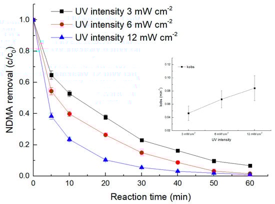 The removal efficiency of NDMA via the UV/sulfite ARP under three levels of UV intensity (3 mW cm−2, 6 mW cm−2 and 12 mW cm−2) was investigated, and the results are shown in Figure 4. It can be seen that 35.39% of NDMA was removed within 5 min of the reaction via the UV/sulfite ARP under 3 mW cm−2 UV intensity, while 61.63% of NDMA removal efficiency was achieved within the same reaction time when the UV intensity increased to 12 mW cm−2. The linear increase in the kobs shown in Figure 4 indicated that an increase in UV light intensity leads to a proportional increase in the NDMA removal rate. According to Lee’s study [], the increase in UV intensity would lead to a proportional increase in the photolysis rate of NDMA and the radical formation rate from sulfite. Therefore, the increase in the total removal rate of NDMA should be proportional to the increase in the UV intensity. A similar trend was found by Botlaguduru, who investigated the bromate removal via UV/sulfite ARPs []. It is worthwhile considering that increasing the UV intensity will increase the energy consumption and ultimately increase the treatment cost. However, almost 90% of NDMA removal efficiency can be achieved under all three of the UV intensity levels after 60 min of the reaction in this study. Therefore, it is necessary to choose an appropriate UV intensity to balance the NDMA removal efficiency and the treatment cost.