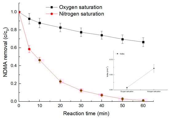 The effect of dissolved oxygen on the removal efficiency of NDMA via the UV/sulfite ARP was investigated. The results from Figure 5 showed that 33.58% of NDMA was removed within 60 min of the reaction via the UV/sulfite ARP under oxygen saturation conditions, while almost 98.82% of NDMA removal efficiency was achieved within the same reaction time under nitrogen saturation conditions. In general, the presence of DO can substantially decrease the removal efficiency of contaminants in most ARP systems. This inhibitory effect was mainly due to the strong oxidizing superoxide radicals (•O2−) generated by dissolved oxygen under the excitation of UV light, which could easily capture the reducing active radicals such as hydrated electrons, hydrogen radicals and sulfite radicals during the reaction. As mentioned above, the radical reaction was the dominant reaction pathway for NDMA degradation via the UV/sulfite ARP. The reduction of the reducing active radicals would inevitably affect the removal efficiency of NDMA. However, the opposite result was found; the presence of dissolved oxygen could increase the removal efficiency of the target pollutants. The promoting effect was attributed to the formation of oxidizing active radicals (such as •OH and •SO4−) by the reaction between dissolved oxygen and sulfite radicals. The degradation of the target pollutants was achieved through the advanced oxidation pathways [].
