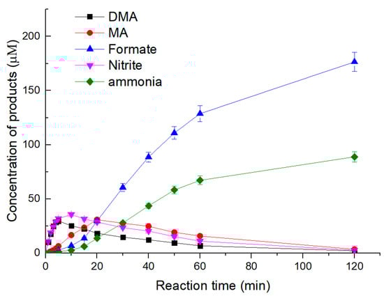 The degradation products of NDMA via UV/sulfite ARP were investigated and the results are shown in Figure 6. As NDMA decomposed using UV/sulfite ARP, dimethylamine (DMA) and nitrite were the main intermediates generated first, with a maximum concentration of 29.7 µM and 35.7 µM, respectively. Afterwards, DMA underwent further degradation and its concentration decreased continuously until it was completely removed at the end of the reaction. Methylamine (MA) was the intermediate product of DMA with a maximum concentration of 30.9 µM after 20 min of the reaction. Similarly to DMA, MA also underwent further degradation and was completely removed at the end of the reaction. However, formate and ammonia were the final degradation products of DMA and MA. Different to DMA or MA, their concentrations constantly increased with the prolongation of the reaction time. The concentrations of formate and ammonia were 186.5 µM and 88.9 µM at the end of the reaction. Moreover, it is worth noting that no formaldehyde and methanol were detected during the whole reaction process, which was probably due to their higher reaction rate coefficients with radicals []. Similarly to DMA, nitrite underwent further degradation and was completely removed at the end of the reaction. Nitrogen (N2) was likely to be the final degradation product of nitrite according to other researchers. However, it was difficult to quantitatively detect the formation concentration of nitrogen under our laboratory conditions. Moreover, nitrate was not detected in solution, which indicated that the reduction of nitrite was the predominant pathway.