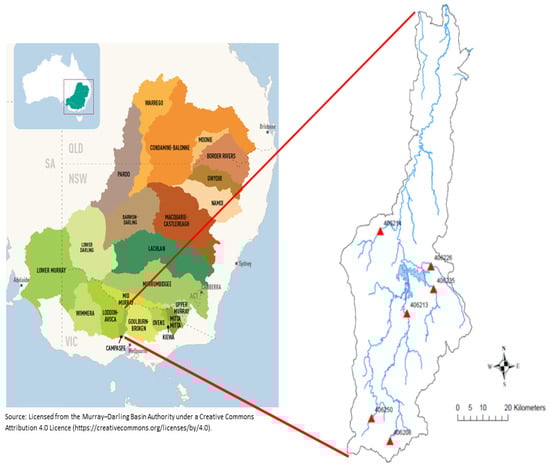 Quality-controlled AMF data derived from daily streamflow data of six stations, which are located at the outlet of six unregulated sub-basins of Campaspe River Basin, were used for the analysis in this study. As the length of data record is significant for the trend and frequency analysis, stations with a minimum data length of 40 years were considered. Data were derived from hydrologic reference stations [23] created by Bureau of Meteorology, Australia. Location, name, sub-basin area, and available data period of the selected stations are shown in Table 1. Sub-basins with a minimal effect of land-use change and regulation through artificial storage were considered in selection of the stations. The location of the Campaspe River Basin and selected stations are shown in Figure 1.