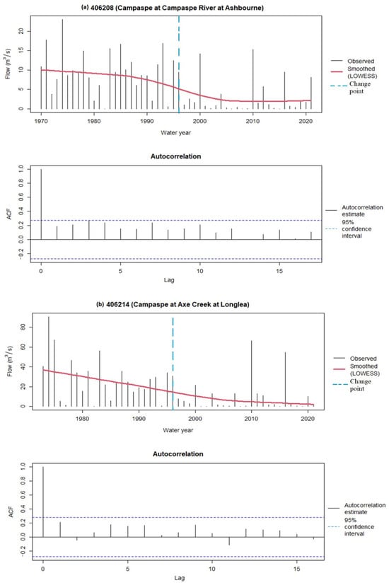 In Table 4, S and NS indicate statistically significant (with significance levels shown within brackets) and insignificant changing points, respectively. Table 4 shows that the statistically significant change point was detected for all stations except Station 406250, and the significant change point for all stations is the year 1996. The change point (year 1996) is indicated in Figure 2 with a vertical blue dashed line at Stations 406208 and 406214.