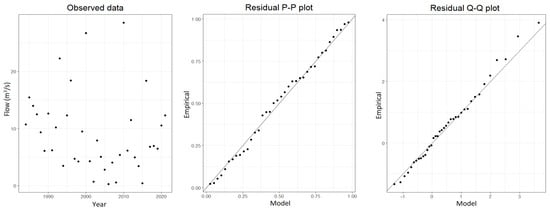Residual P-P and Q-Q plots are special forms of P-P and Q-Q plots. Residual diagnostic plots are useful for the models with covariates since the model quantile cannot be defined in those models as a different GEV model is expressed with each set of covariates. In the residual diagnostic plots, the model residuals are generated for each data point based on fitted model parameters to ensure data points belong to a common distribution. Similar to regular diagnostic plots, in residual diagnostic plots, a well-fitted model is represented by the points lying close to the diagonal line [41,44].