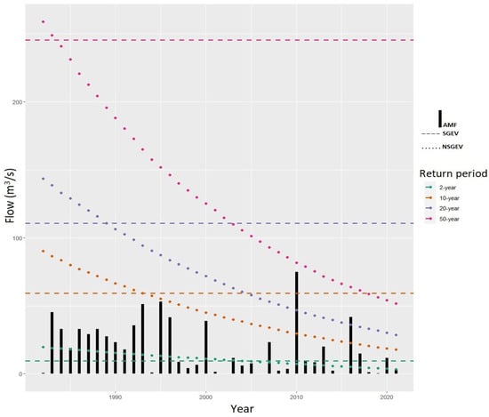 As can be seen in Table 6 and Figure 4, the design flood estimates of NSGEV15 are decreasing over time at Station 406235. In Figure 4, the horizontal lines indicate the design flood estimation from the SGEV model for certain return periods. Design flood estimates of SGEV for 2-, 10-, 20-, and 50-year return periods at Station 406235 are 9.5 m3/s, 59.2 m3/s, 110.7 m3/s, and 245.5 m3/s, respectively. As the parameters of the SGEV model are constant, design flood estimates from the SGEV model do not show variation over time. This is specifically important for Stations 406235 and 406250, where NSGEV outperformed the SGEV counterpart. For example, the difference between 20-year design floods of SGEV and NSGEV models at Station 406235 is −74% in 2021. Table 7 indicates the change percentage of 2-, 10-, 20-, and 50-year design floods in 2021 between SGEV and the best fitting NSGEV for the stations where the NSGEV model showed better fitting than the SGEV (i.e., Stations 406235 and 406250).
