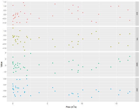 As shown in Table 7, the design floods in 2021 derived from non-stationary models were lower than those derived from stationary models. The difference between non-stationary and stationary models is particularly significant for Station 406235 where the NSGEV15 model was the preferred model. In those stations (in which non-stationary GEV models should be preferred), deriving a design flood from conventional stationary models will result in overestimation of the design flood. This will cause uneconomical water infrastructure design and poor water resource planning and management. As explained in the Methodology section, effects of ENSO, IOD, IPO, and SAM climate drivers on AMFs were investigated in this study through associating SOI, DMI, TPI, and SAM index as a physical covariate to the non-stationary GEV models. It is found that none of the non-stationary GEV models with the physical covariate overperformed the GEV counterpart models. This is the case for all the stations in the study basin. Therefore, there is insufficient evidence to express the AMF non-stationarity in relation to the studied climate drivers. Figure 5 shows the flow data plotted against physical covariates at Station 406208 to examine whether flow is correlated with the covariates used. As can be seen from Figure 5, there is no strong correlation between AMF and physical covariates (SOI, DMI, SAM, and TPI).