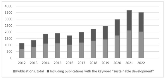 Methods of bibliometric analysis are used in this study in combination with keyword analysis. The Scopus information database for the period from 2012 to 2022 was used as the data source. This database was chosen because it provides the most comprehensive coverage of quality articles from high-ranking journals in more than 230 countries. The period for research from 2012 to 2022 was chosen due to the desire to reflect modern research trends in this subject area, given the relatively rapid obsolescence of socio-economic research.