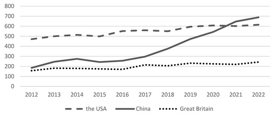 Data on the annual number of publications from the top 3 countries by the number of publications. Note: Compiled by the authors according to the source: https://www.scival.com (accessed on 11 October 2023).