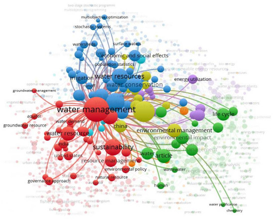 In order to understand the subject field of the research opportunities in water management issues, we will analyze the relationship of keywords in scientific papers published during the study period (Figure 3), assuming that the keywords adequately reflect the content of the study.