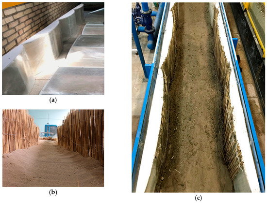 The construction steps of varying width of the experimental flume; (a) the PVC barriers, (b) The row of reeds, as the wall vegetation, (c) the experimental flume with variable width and vegetated walls.