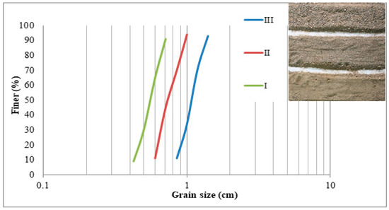 In the current research, experiments were conducted in a laboratory flume that is 11.25 m long, 0.9 m wide, and 0.7 m deep. In the upstream section of the flume, there is a stilling basin with a bar screen which helps the flow dissipate energy after entering into the flume and maintains it to reach a fully developed flow along the flume section for experimentation. The tailgate located at the downstream end of the flume was used to regulate the water depth in the flume. An ADV (Acoustic Doppler Velocimeter), which has an accuracy of 0.001, was used to measure the instantaneous velocity components in three directions (x-streamwise, y-transverse, and z-vertical directions) at different cross sections along the flume and at different distances from the channel sidewall. The channel with varying widths was prepared using Polyvinyl Chloride (PVC) barriers of different diameters (from the minimum diameter of 0.22 m to the maximum diameter of 1.2 m) and covered with a transparent fibrous sheet. The reeds were used to model natural vegetation. Each reed element has an average diameter of 10 mm. The rows of reeds were used as emergent natural vegetation and placed uniformly on both sidewalls of the flume. To compare results of previous studies and incipient conditions [15,16], three sands with different median particle size of 0.56 mm (), 0.74 mm (), and 1.08 mm () were used in this study. The particle uniformity is generally estimated by the geometric standard deviation coefficient, defined as , where and are the diameters of the bed particles of which 84% and 16% are finer than them, respectively. As the calculated was less than 1.4, the sediment particles used in this study belong to the uniform sand [4]. It should be noted that the visual observation approach was employed for distinguishing the bed particle movements. In this regard, the “medium sediment transport” classified by Kramer was considered for particle movements. In this experimental study, the discharge was kept as constant. By adjusting the tailgate at the downstream end of the flume, the water level was lowered until the mentioned criteria for the incipient motion of bed material was achieved. Then, the measurements were conducted. Figure 1 shows the construction steps of the channel with varying width and vegetated sidewalls. Figure 2 presents the grain size distributions for three different bed materials.
