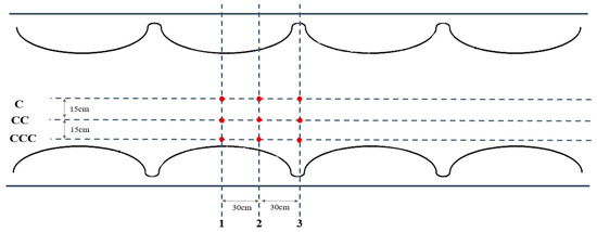 As shown in Figure 3, to investigate the effects resulting from the variation of channel width and vegetation on the sidewalls, measurements were conducted at 9 places along three longitudinal axes (central axis or “C”-axis, “CC”-axis, which is 15 cm from the “C”-axis, and “CCC”-axis, which is 30 cm from the “C”-axis) and at three cross sections (Figure 3–red points). It should be noted that the ADV measurements were conducted in the flume section that is 8 m downstream from the flume entrance, where the flow is fully developed turbulent flow. Table 1 summarizes the conditions for different experimental setups. One can see from Table 1 that the experiments were carried out using three different sands as the bed material with three different slopes of the channel bed.